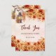 Una tarjeta de agradecimiento para una ducha nupcial. Un fondo degradado rosa dorado y rosa claro. Decorado con un farol antiguo y hojas de árbol de otoño naranjas. En la parte delantera, una gran letra a mano y el texto: Gracias, su texto, título y una fecha.