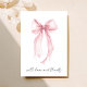 Tarjeta de agradecimiento para baby shower elegante con un delicado lazo coquette de acuarela rosa claro y "con amor y gracias" en una tipografía moderna y chic. En el reverso, personaliza tu mensaje de agradecimiento con letra simple y agrega tu nombre en una tipografía que semeja una firma, o déjalo en blanco para una nota manuscrita.