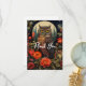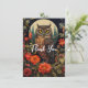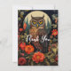 Gracias tarjeta con una lechuza de aspecto fresco con una mirada penetrante. Luna llena en la parte de atrás con un jardín de flores rojas.