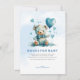 Esta bonita ducha de bebé, libros de diseño para bebés, cuenta con un adorable oso de peluche acuarela con globos en forma de corazón y una tipografía personalizada en azul y negro.