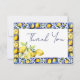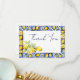Tarjeta de agradecimiento para fiesta de boda y lluvia de regalos con tema mediterráneo de azulejos azules Majolica de Amalfi Positano Vietri y limones, azul, blanco y amarillo.