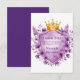 Esta exquisita plantilla de invitación de boda presenta una corona dorada real adornada con joyas de amatista, ubicada sobre un escudo heráldico enmarcado en oro. Alrededor del diseño hay peonías lavanda y violeta exuberantes, creando un motivo floral lujoso y vintage. Perfecto para bodas románticas con tema real o celebraciones elegantes con un toque de nobleza y encanto floral. El escudo en blanco proporciona espacio para nombres, fechas o mensajes personalizados.
