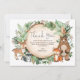Extraordinaria carta de agradecimiento con ilustracion de verdes acuarelas rústicas, follajes y adorables animales del bosque: zorro, oso, ciervo, mapache, búho