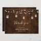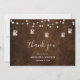Tarjeta de agradecimiento de boda con hermosa madera oscura, luces de cadena y frascos de mason. Los frascos de mason tienen pequeños corazones dentro y también luces. La tipografía de letra a mano luce increíble,