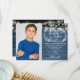 Personaliza con tu foto y mensaje de agradecimiento especial de primera comunión en tipografía chic en este elegante diseño rústico con luces de cuerda y guirnalda de follaje dibujada a mano sobre fondo de paneles de madera azul. Diseñado por Thisisnotme©