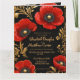 This luxury black, red, and gold floral wedding invitation features an opulent botanical design with rich red poppy-style flowers and elegant gold baroque accents on a deep black background. The dramatic contrast and refined ornamental details create a sophisticated and timeless aesthetic, perfect for formal and upscale weddings.