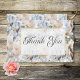 El diseño de esta tarjeta de agradecimiento boda presenta un hermoso patrón floral suave de color blanco y azul perwinkle sobre un polvoriento fondo azul perwinkle envejecido. El texto se muestra en un área de texto transparente blanco suave con un marco purpurina de oro falso. la parte posterior continúa el patrón floral. Esta tarjeta forma parte de la suite boda Blue & White Rustic Floral Gold Frame creada por Simply Farmhouse Press.
