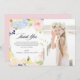 Envía gracias a familiares y amigos por ser parte de tu día especial con esta tarjeta plana de agradecimiento femenina y elegante. Cuenta con ilustración de acuarela de flores rosadas, amarillas, azules y púrpuras. Esta tarjeta de agradecimiento floral es perfecta para bodas de primavera y verano, primeras comuniones, bautizos, cristianismos y mucho más. Personaliza agregando un mensaje y foto.