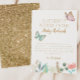 Elegante y caprichosa mariposa y florida temática jardín ducha bebé gracias a la tarjeta de patrón con un ilustracion acuarela de mariposas rosas y azules con falsos purpurinas de oro y jardín de flores y follaje en la parte inferior. El mensaje por omisión agradece a los clientes por asistir a la ducha y por su regalo.