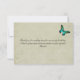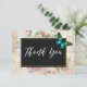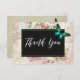 Una carta de agradecimiento con una elegante mariposa verde. Gracias está escrito en una fuente de moda blanca. Un marco negro con un borde dorado debajo. El fondo es un patrón de collage vintage con rosas y un aspecto anticuado poco original. El reverso tiene un patrón de damasco de color marrón con un mensaje que puedes personalizar.