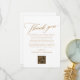 Tarjeta de agradecimiento de mesa de recepción de boda con caligrafía dorada elegante con código QR y texto personalizado... Una tarjeta simple pero elegante de agradecimiento para adornar los platos en las mesas de recepción. Simplemente revise el texto "marcador de posición" con sus propios mensajes y cambie el gráfico del código QR escribiendo la URL de su sitio web de boda. Todo el texto excepto los elementos de caligrafía se puede revisar fácilmente en la plantilla de personalización.