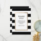 Esta elegante, audaz y moderna tarjeta de boda a rayas blancas y negras Gracias está muy de moda. Con un overlay blanco bordeado de un Relieve metalizado rosa de imitación de oro, el texto está escrito en un hermoso y elegante sans serif. La parte posterior de la tarjeta presenta las mismas franjas horizontales en blanco y negro que aparecen en la parte delantera. La invitación perfecta para la novia discriminante y parte de una suite de invitaciones.