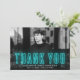 Modern graduation thank you card displaying the graduate's horizontal photo with "Thank You" in cyan neon lettering. Personalize the photo graduation thank you card by adding the graduate's name, school name, and graduation year. The graduation photo thank you card reverses to display your typed thank you message or leave blank to handwrite your own. The solid cyan background can be changed to a color of your choice.