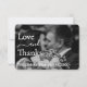 Front side: Full-bleed photo placeholder with a romantic "Love and Thanks" script overlay and your names and wedding date.