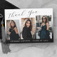 Esta elegante y moderna tarjeta de 3 graduaciones fotográficas "Gracias", presenta elementos de diseño de texto moderno fundido con un elegante guión de caligrafía. Sus fotos de grado se muestran en la parte delantera de la tarjeta mientras que la parte posterior de la misma ofrece espacio de texto personalizado para un mensaje de agradecimiento o se puede dejar en blanco si se desea escribir a mano el mensaje. Un gradiente blanco de moda se desvanece para regular el negro en la parte delantera de la tarjeta con el gris platino en la parte posterior o personalizar fácilmente a los colores de su elección.