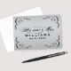 Diseño de tarjeta de agradecimiento de boda con borde negro y monograma de "Señor y Señora" en caligrafía. Personaliza el frente y el texto interior con un mensaje personalizado. La imagen de fondo de plata se puede mantener o eliminar, y el color de fondo se puede cambiar a blanco o cualquier otro tono claro.