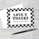 Un boda festivo y elegante, "Love and Gracias", tarjeta de agradecimiento por un evento casual de verano en el patio trasero de BBQ. Incluye texto personalizado para los nombres de novias y novios u otro texto. Colores de diseño en blanco y negro con un fondo con estampado de gingham/mantel. El formato de tarjeta doblada incluye espacio en el interior para un mensaje manuscrito.