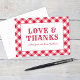 Un boda festivo y elegante, "Love and Gracias", tarjeta de agradecimiento por un evento informal de verano en el patio trasero. Incluye texto personalizado para los nombres de novias y novios u otro texto. Colores de diseño rojos y blancos con un fondo con motivos de gingham/mantel. El formato de tarjeta doblada incluye espacio en el interior para un mensaje manuscrito.