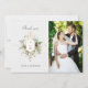 Esta hermosa tarjeta de agradecimiento botánico acuático de invierno incluye ramos de rosas y flores de marfil, bayas rojas de hojalata, abetos y copos de nieve dorados alrededor de una elegante etiqueta dorada para su monograma sobre un fondo gris perla pálido. Incluye campos de texto editables y plantilla de foto. Volver a la izquierda en blanco para el mensaje manuscrito.