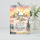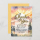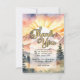 Diseño de cumpleaños boho y rústico neutral en cuanto al género con un paisaje de estilo acuarela con montañas, abetos y un sol naciente.