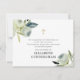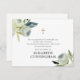 Este diseño moderno se compone de una simple tipografía serif con una falsa cruz dorada y florales botánicas