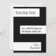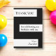 Esta elegante tarjeta de agradecimiento en blanco y negro es perfecta para un cumpleaños moderno. el diseño sencillo presenta una elegante caligrafía en negro sobre un fondo de rayas blancas.