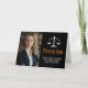 Elegante escuela de derecho negra y naranja, tarjetas de agradecimiento con la escala de justicia junto a tu foto de graduación. Personalizar estas tarjetas de agradecimiento del abogado con escritura blanca de moda junto a la fotografía de su abogado.