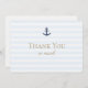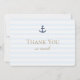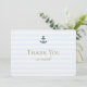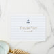 Esta plantilla de tarjeta de agradecimiento temática náutica personalizada es perfecta para agradecer a los invitados y a los que envían buenos deseos en diversas ocasiones, incluyendo bodas, nacimientos, jubilaciones y otros hitos. Cuenta con un ancla azul marino y texto en un tono dorado elegante sobre una base que incluye rayas horizontales azules suaves. El ancla no está coloreada de manera uniforme, hay motas sin color, lo que le da un aspecto cálido y desgastado y un sabor a mano que nos recuerda a una impresión de bloque de madera o una talla de madera. De hecho, la imagen del ancla que inspiró este diseño se hizo originalmente con un sello simple, lo que explica su encanto. En el reverso hemos incluido algo de texto de marcador de posición en el mismo tono dorado. Puedes incluir tu nombre(s) al final de tu mensaje personalizado, o dejarlos fuera a favor de firmarlo a mano. Y por supuesto, si lo prefieres, puedes hacer que la parte posterior sea completamente en blanco para que puedas escribir tu mensaje enteramente a mano. En cualquier caso, por favor asegúrate de eliminar nuestro texto de marcador de