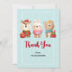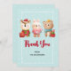 Gracias tarjeta con un lindo ilustracion con un conejito, un oso y un ciervo todos vestidos con ropa festiva. Adorable y caprichoso.