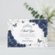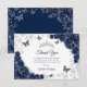 Navy silver Quinceanera celebration thank you card. Features, script font, butterflies, watercolor roses and tiara. Perfect for an elegant princess style glam celebration. Personalize with your own details.