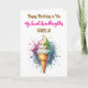 Una tarjeta de cumpleaños para una nieta con un delicioso cono de helado en el frente. En el interior hay una página de color con un perro cachorro sosteniendo un globo de cumpleaños. Puede agregar el nombre de su nieta en el área de personalización.