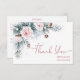 Tarjetas de agradecimiento para lluvia de boda de invierno 'Nieve enamorada', rosas de invierno color rosa polvoriento y rosado en ramas de pinos nevados con conos de pino y copos de nieve, tarjetas de agradecimiento para lluvia de boda de invierno