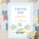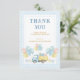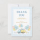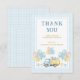 Di las gracias con un estilo dulce con esta tarjeta de agradecimiento de primer cumpleaños de camión de volteo. Con un camión lindo que lleva regalos y globos con un suave patrón de gingham azul bebé y bordes punteados, es perfecto para la fiesta de primer cumpleaños de un niño. Ideal para agradecer a los invitados y completar su conjunto de papelería de fiesta con un toque final encantador.