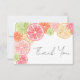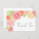 Esta tarjeta plana de agradecimiento presenta un tema cítrico brillante y alegre, perfecto para celebraciones de verano. El diseño de la parte frontal incluye rodajas de cítricos pintadas con acuarela - toronja, lima, limón y naranja - en tonos de rosa, naranja, amarillo y verde, dispuestas a lo largo de la parte superior y el lado izquierdo. "Gracias" se muestra en la esquina inferior derecha en una letra simple y elegante.