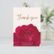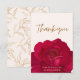 Tarjeta de agradecimiento para la fiesta de despedida de soltera con tema de novia en flor con rosas y peonías en color rojo, rosa y burdeos con patrón floral y botánico dorado. Un fondo perfecto de color dorado y blanco crema con arreglo floral de rosas rojas.