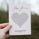 Esta hermosa tarjeta de aniversario de la nube de palabras incluye palabras sentidas como "cariño", "abrazos y besos", "amor", "compañeros de alma" y "risa". Personalice esta tarjeta con los nombres de la pareja y la fecha de boda. Haga clic en el botón de edición/personalización para personalizar de este diseño. El interior se deja en blanco intencionalmente para tu mensaje personal. Si tiene alguna pregunta o desea un diseño personalizado, no dude en enviarme un mensaje a susan@susannewberrydesigns.com.