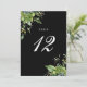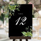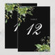Estos elegantes números de mesa de boda florales botánicos verdes se pueden personalizar con tipografía chic en un fondo negro. Las tarjetas se imprimen en el anverso y el reverso (a doble cara). Diseñado por Thisisnotme©