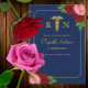 Nurse graduation with pink and red roses against a navy blue background. Gold caduceus and script typography. Photo template via Pixabay licensed under CC0 and must be replaced with your own photo.
