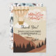 Show your heartfelt gratitude with this adorable Adventure Awaits baby shower thank you card for a boy! Featuring a soft watercolor design with a cute teddy bear in a hot air balloon floating above earth-tone mountains, this card perfectly matches your travel-themed or woodland-style baby shower.