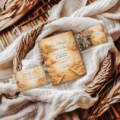 Celebrate a cozy first birthday with this warm cinnamon roll–inspired design featuring soft bakery details, rustic textures, and a gentle neutral palette. Perfect for a “little bun” or bakery-themed party, this invitation sets a sweet, welcoming tone for a memorable first birthday. Fully editable to personalize names, dates, and party details.