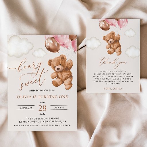 Tarjeta De Agradecimiento Oso de peluche, globos rosados, primer cumpleaños