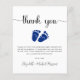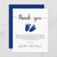 Gracias a tu bebé que duchó a los invitados con esta tarjeta de agradecimiento encantadora de presupuesto con "gracias" en un guión elegante con toques y una acuarela azul marino de pies de bebé. Debajo puede personalizar fácilmente su mensaje de agradecimiento o dejar en blanco una nota manuscrita.