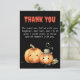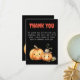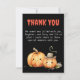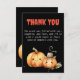 La tarjeta de "Gracias por venir" con tema de Halloween para baby shower presenta una cautivadora paleta de colores negro y naranja, capturando la esencia de la temporada espeluznante. En la parte inferior de la tarjeta, hay una encantadora ilustración de calabazas lindas que hacen un gesto de aprobación a la magia que se avecina en la celebración del baby shower.