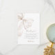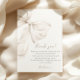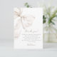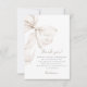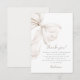 Tarjeta de agradecimiento para baby shower con tema "Ella está atando el nudo" con un diseño de lazo blanco elegante.