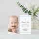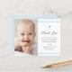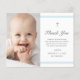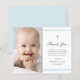 La tarjeta de agradecimiento para bautizo de niño con elegancia moderna y presupuesto es moderna y limpia, con rayas suaves azules y una cruz con foto. El tipo gris personalizable le permite cambiar toda la información en la tarjeta a su gusto. Perfecta para el bautizo de un niño pequeño.