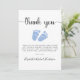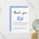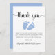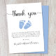 Cuta tarjeta de agradecimiento para tu ducha de bebé con "¡gracias!" en un guión elegante con toques y una acuarela azul de pies de bebé. Debajo puede personalizar fácilmente su mensaje de agradecimiento o dejar en blanco una nota manuscrita.