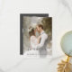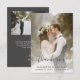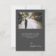 Tarjeta de agradecimiento boda moderna que incluye una foto vertical personalizado en la parte delantera y una foto horizontal en la inversa. Las palabras "Gracias" aparecen en el guión de escritura a mano gris a carbón con cambios decorativos al principio y al final. Agregue sus nombres y la fecha y ubicación del boda a continuación en sans serif font. Personalice el reverso con un mensaje de su elección en sans serif blancos en un fondo gris, y agregue su línea de firma en letra decorativa de escritura a mano. Reemplace fácilmente las imágenes de ejemplo con sus propias fotos bodas. Una pantalla de degradado blanco ayuda a asegurar que el texto de la parte delantera de la tarjeta aparezca.