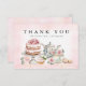 Envía agradecimientos sinceros con esta elegante tarjeta de agradecimiento para una despedida de soltera con tema de té. Con una ilustración de acuarela de una tetera floral vintage, pastel en capas, taza de té y pasteles dulces, este diseño rosa y dorado es perfecto para una celebración de boda romántica o estilo jardín. Personaliza con el nombre de la novia o "la futura Sra." para un acabado considerado y personalizado.