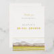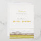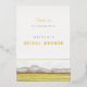 Tarjeta de agradecimiento para despedida de soltera con paisaje de montaña natural. Paisaje natural suave de praderas verdes en flor en primavera. Siluetas de montañas rocosas marrones, campo de hierba y flores de diente de león blancas. Fondo de pintura de acuarela para tarjeta de agradecimiento de despedida de soltera. Colección Praderas en flor.