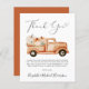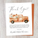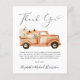 Elegante tarjeta de agradecimiento económica para su ducha de bebé con "Gracias" en un guión elegante con un toque de corazón y acuarelas de un camión vintage que lleva calabazas de naranja y crema y ramos de flores. Personalice su mensaje de agradecimiento en una tipografía moderna y sencilla y añada sus nombres en un guión tipo firma.